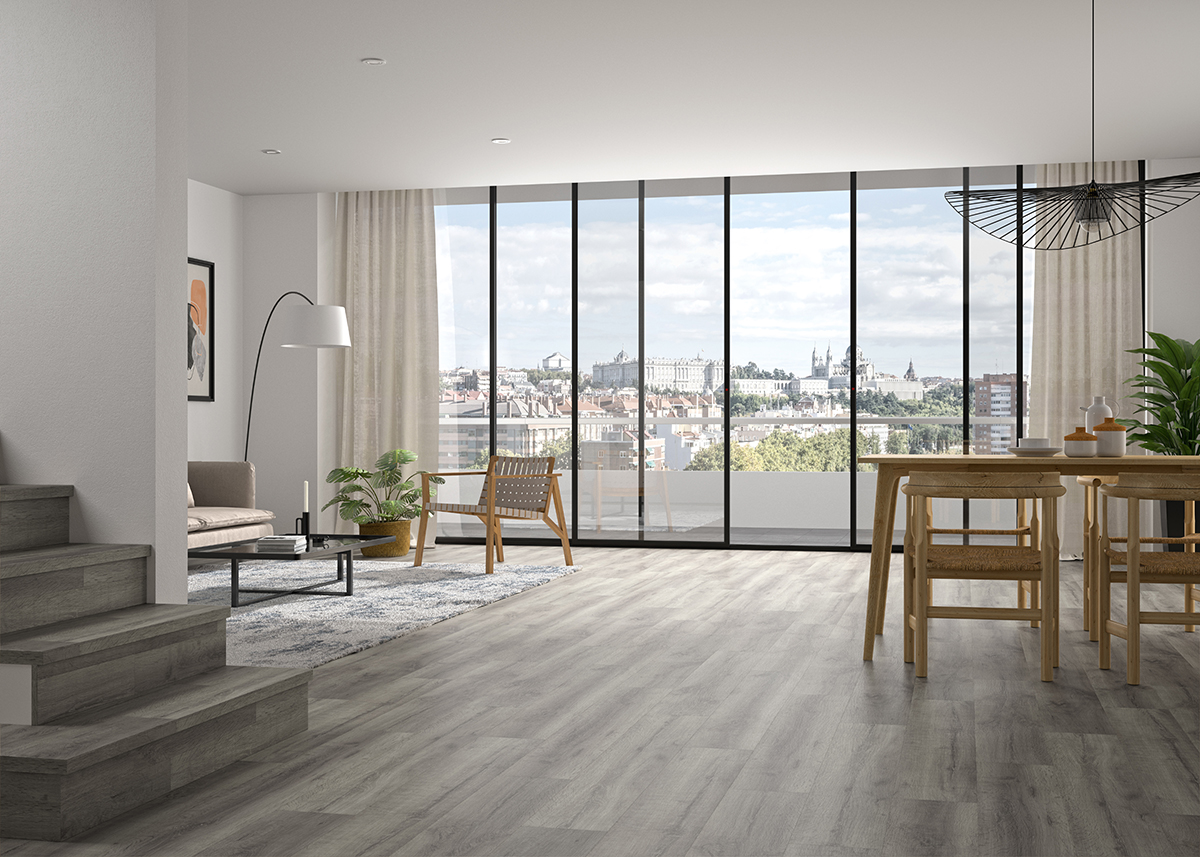 Nudos, grietas, espejuelos, efecto serrado… El diseño Roble Glaciar destaca por su gran carácter y su tonalidad gris, con vetas marcadas y un luminoso pasaje de color. Su grado de rusticidad se ve ensalzado con el acabado profundo Luxor.