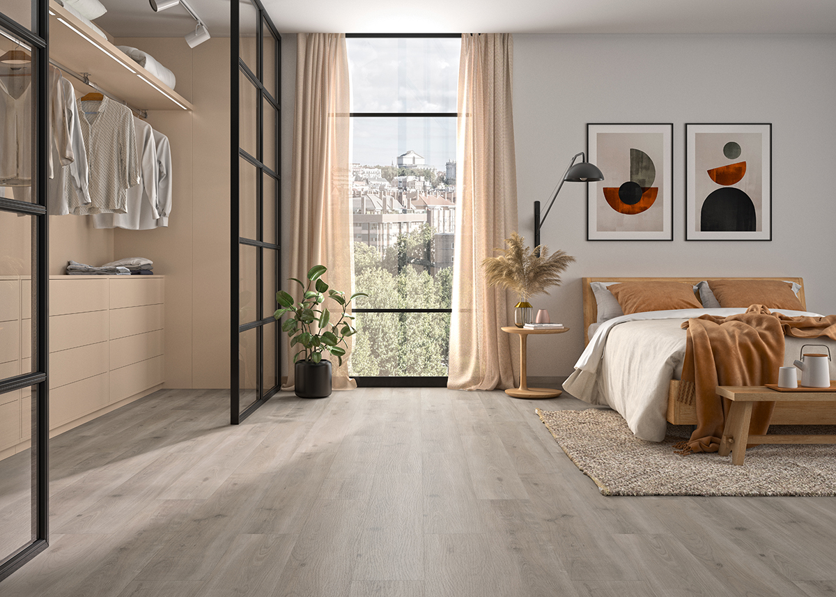 El Roble Pausa suaviza su nivel de rusticidad, nudos, efecto serrado.. con la neutralidad de su tonalidad gris clara consiguiendo transmitir mayor luminosidad y limpieza en cualquier estancia. Acompañado por la textura profunda Luxor, se obtiene mayor realismo en el diseño.