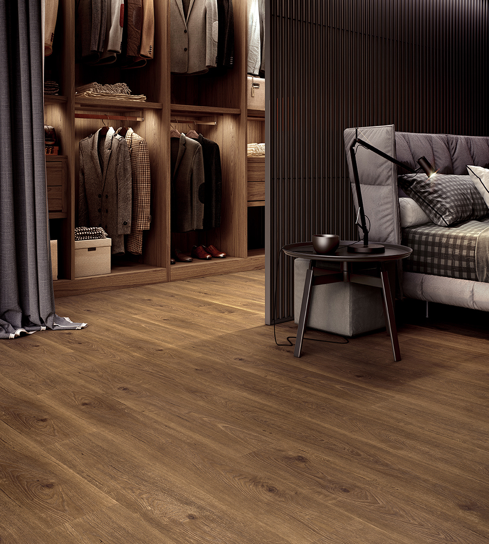 Grietas, nudos, espejuelos… Las imperfecciones de la madera se celebran y se reproducen en este diseño que sincroniza la textura del suelo con el dibujo del Roble Wexford Tostado. Su tono natural de madera envejecida aumenta el realismo del resultado.