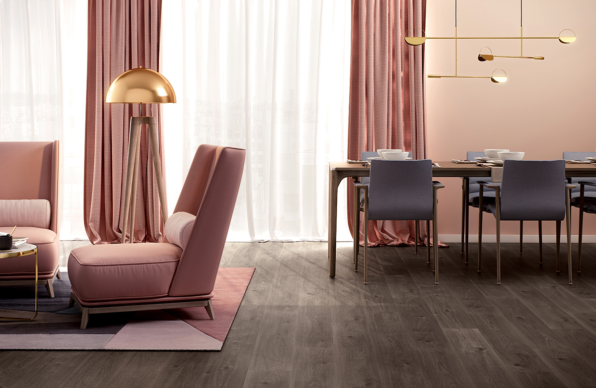 La textura del suelo de este diseño Roble Arles Oscuro se sincroniza a la perfección con el dibujo del roble para conseguir un acabado realista en un tono oscuro que vestirá tu espacio con un ambiente moderno.