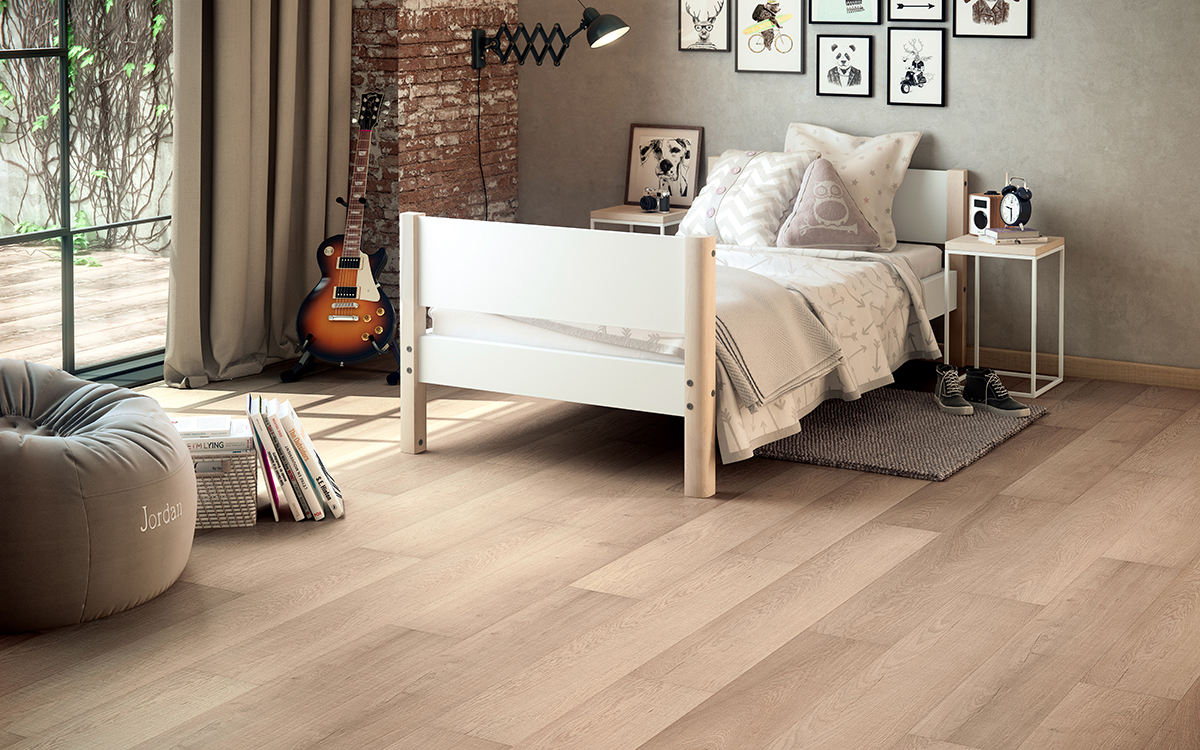 Gracias a su suave contraste entre las lamas, este Roble Serrado consigue una atmósfera de naturalidad en cualquier ambiente. El característico efecto sierra de este roble monolama se reproduce tanto en el dibujo decorativo como en la textura.