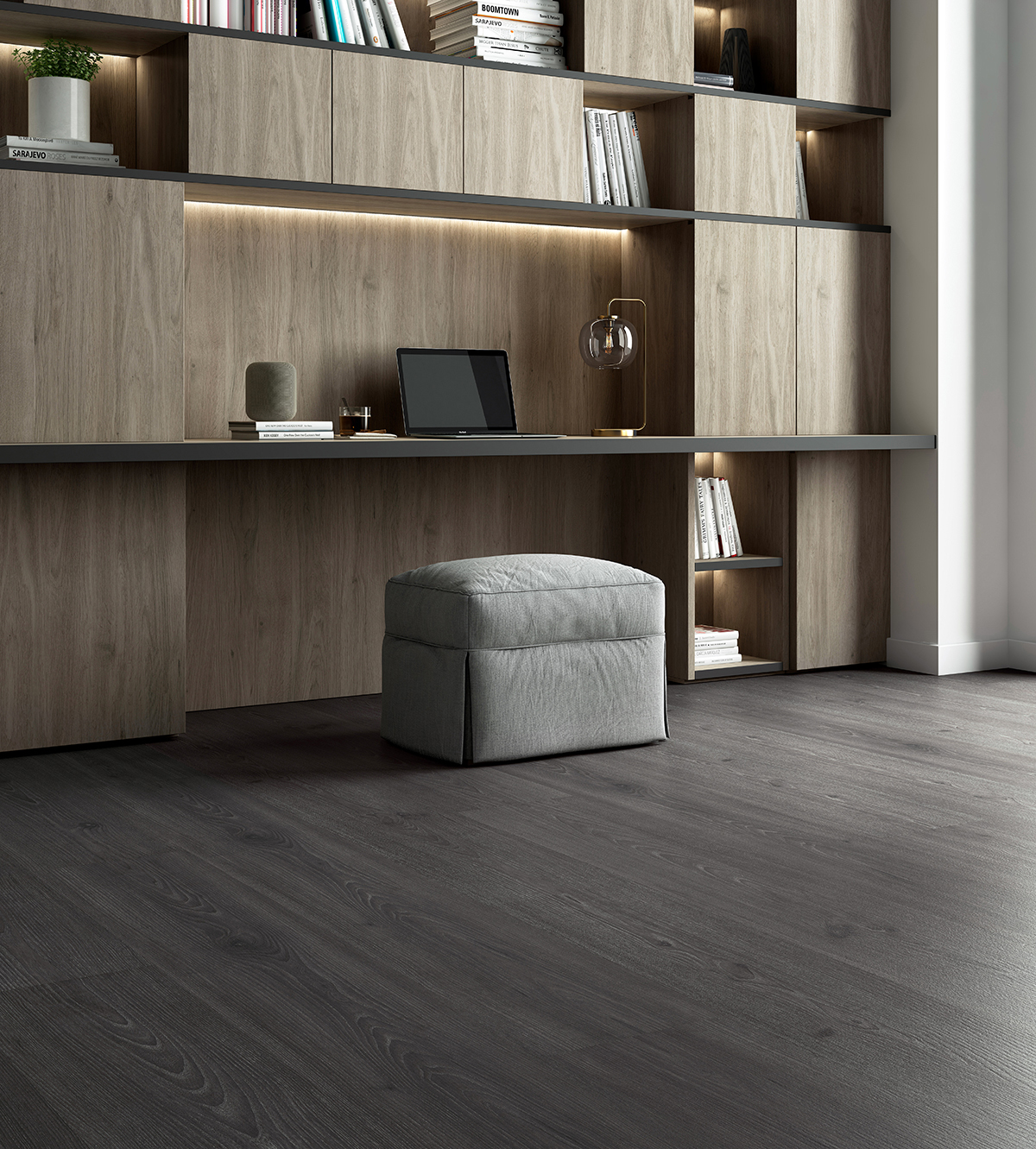 El espacio transmite una atmósfera de dramatismo con este diseño de Fresno Tango Etna en tonos oscuros. Su marcada personalidad se completa con un sutil decapado y la sincronización de la textura con el dibujo de la madera.