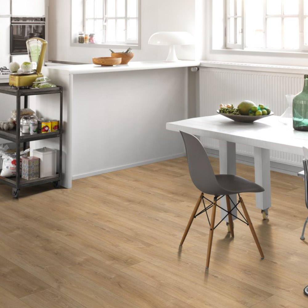 El modelo Roble Nova Calizo se presenta en gran formato de una lama. La estructura natural en este laminado se puede apreciar por el cuidado dibujo de las vetas y los nudos de la madera, el tacto realista y la presencia de bisel longitudinal y en las testas que crea espacios con una gran autenticidad, a imitación de los clásicos suelos de madera natural. La lama de gran formato aporta una gran elegancia y exclusividad al espacio. La tonalidad media de este pavimento encaja en todo tipo de ambientes, aportando calidez y confort.