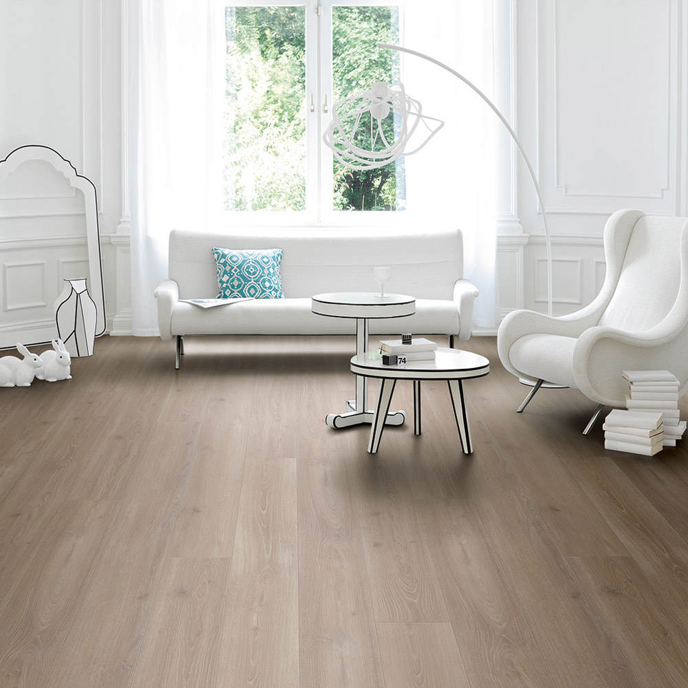 El modelo Roble Skyline Gris Perla se presenta en gran formato de una lama, que aporta profundidad y elegancia a la estancia. La presencia de bisel a los cuatro lados, junto al cuidado diseño natural de cada listón, donde se ve realzada la estructura natural mate de la madera a través de las vetas y los nudos, crea espacios con una gran belleza. Es un laminado que puede instalarse en todo tipo de ambientes, y que aporta una decoración discreta al espacio. De una tonalidad media, este pavimento puede colocarse en diversos ambientes creando una atmósfera cálida y acogedora.